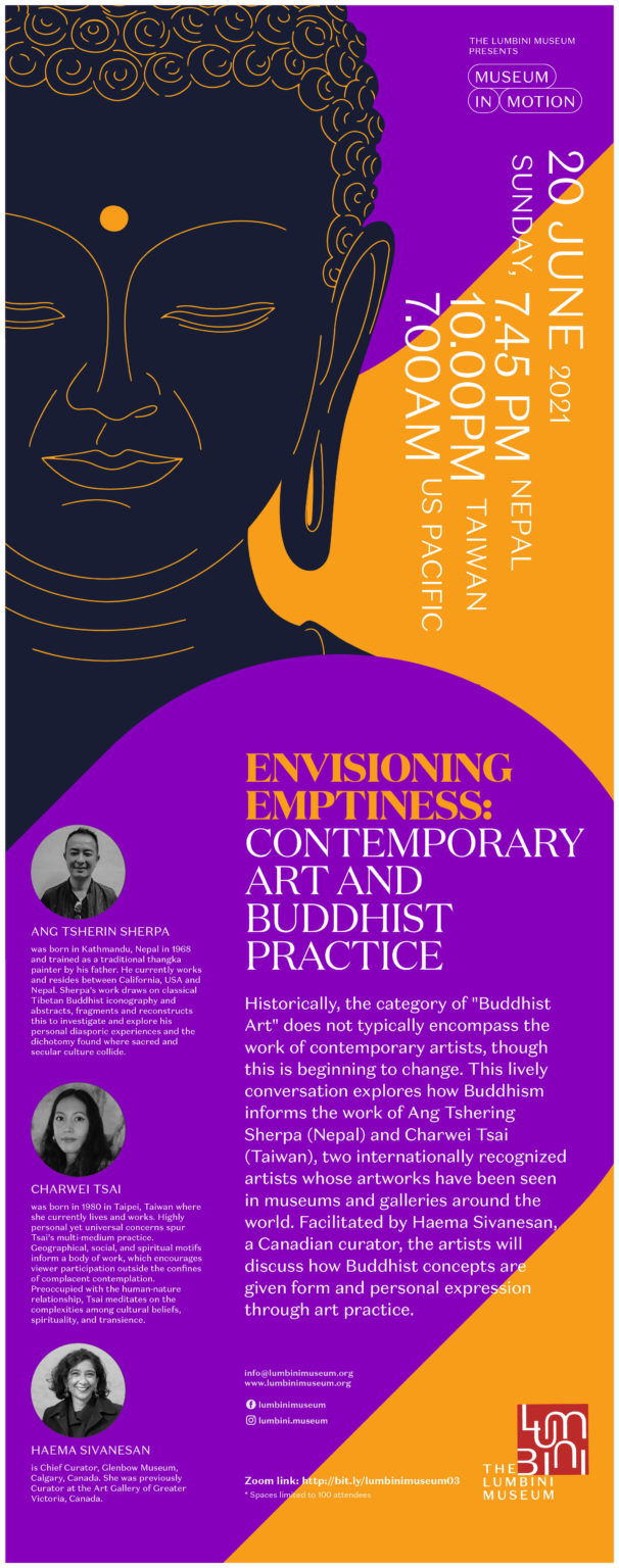 This lively conversation explores how Buddhism informs the work of Ang Tshering Sherpa (Nepal) and Charwei Tsai (Taiwan), two internationally recognized artists whose artworks have been seen in museums and galleries around the world.