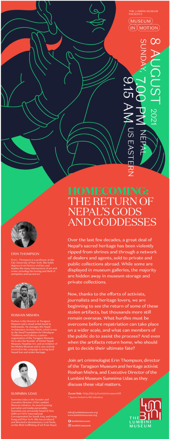 Join art criminologist Erin Thompson, museum director and heritage activist Roshan Mishra and the Lumbini Museum’s executive director Sumnima Udas for Museum in Motion 4 on Sunday 8 August as they debate and discuss these vital issues.